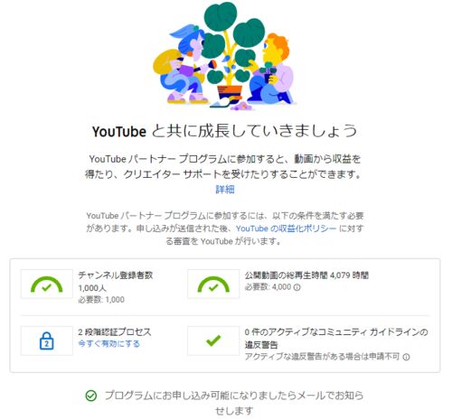 先日YouTubeのチャンネル登録者数が1000人を突破したことをお伝えしましたが、 arsinput.hatenablog.jp 1000人突破に伴い収益化の申請が可能となったたため、収益化の手続きを行いました。 まず、2段階認証の設定をしました。 次に、利用規約を確認し、 Goog…